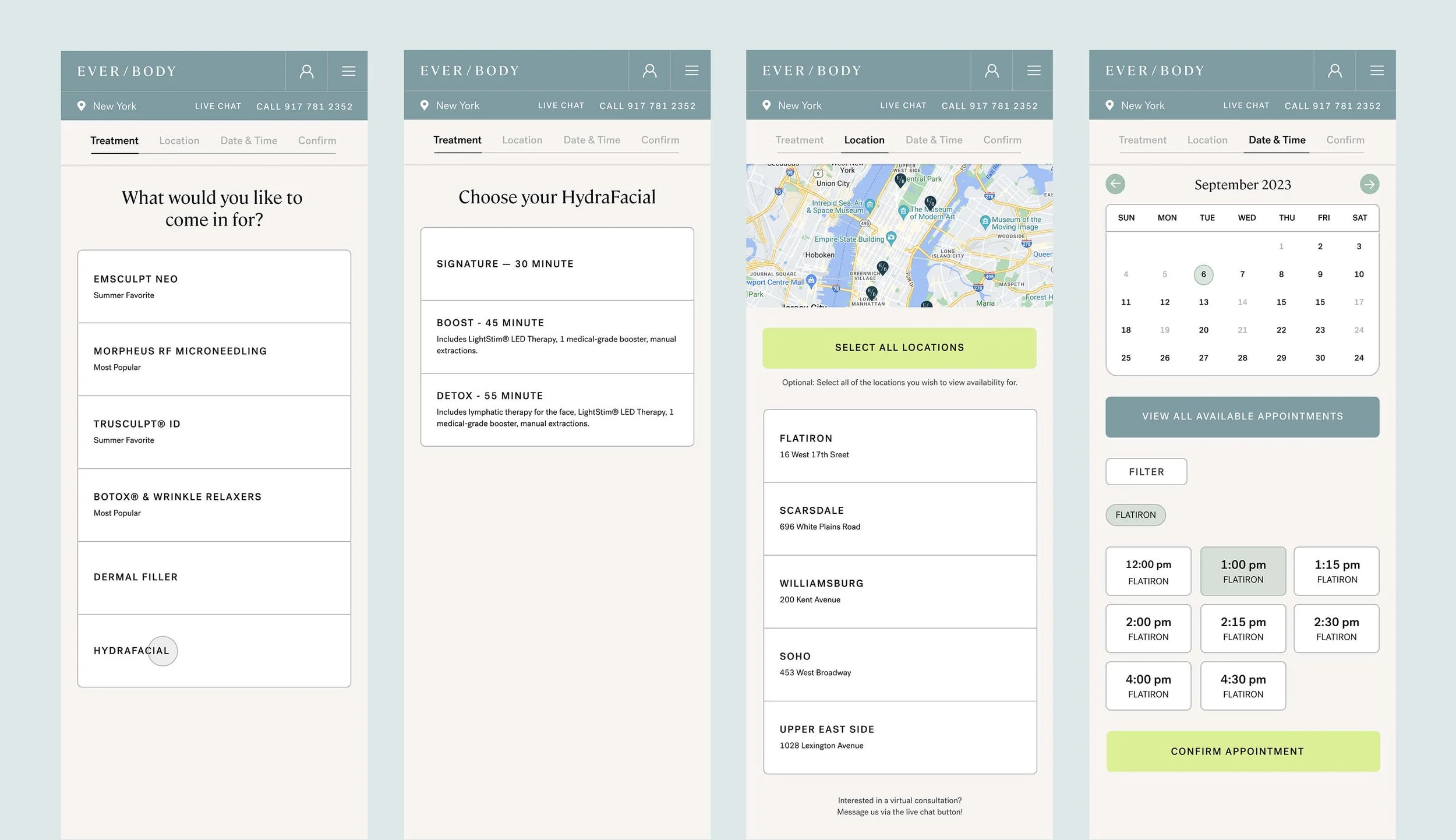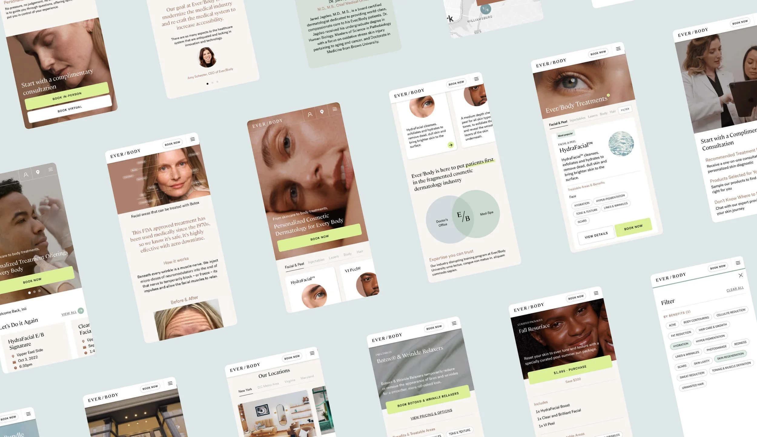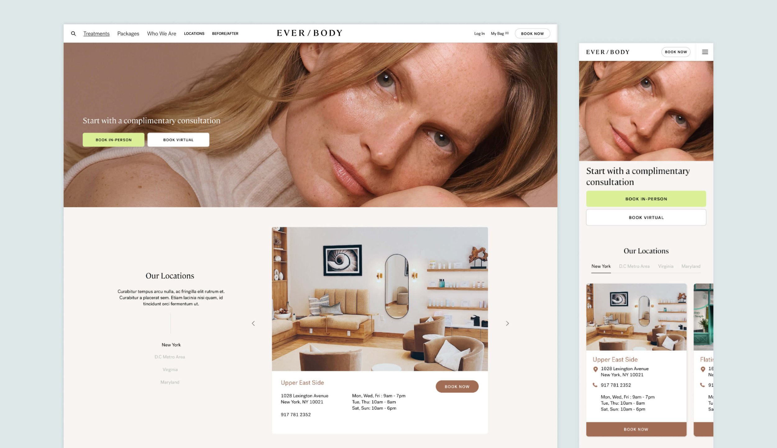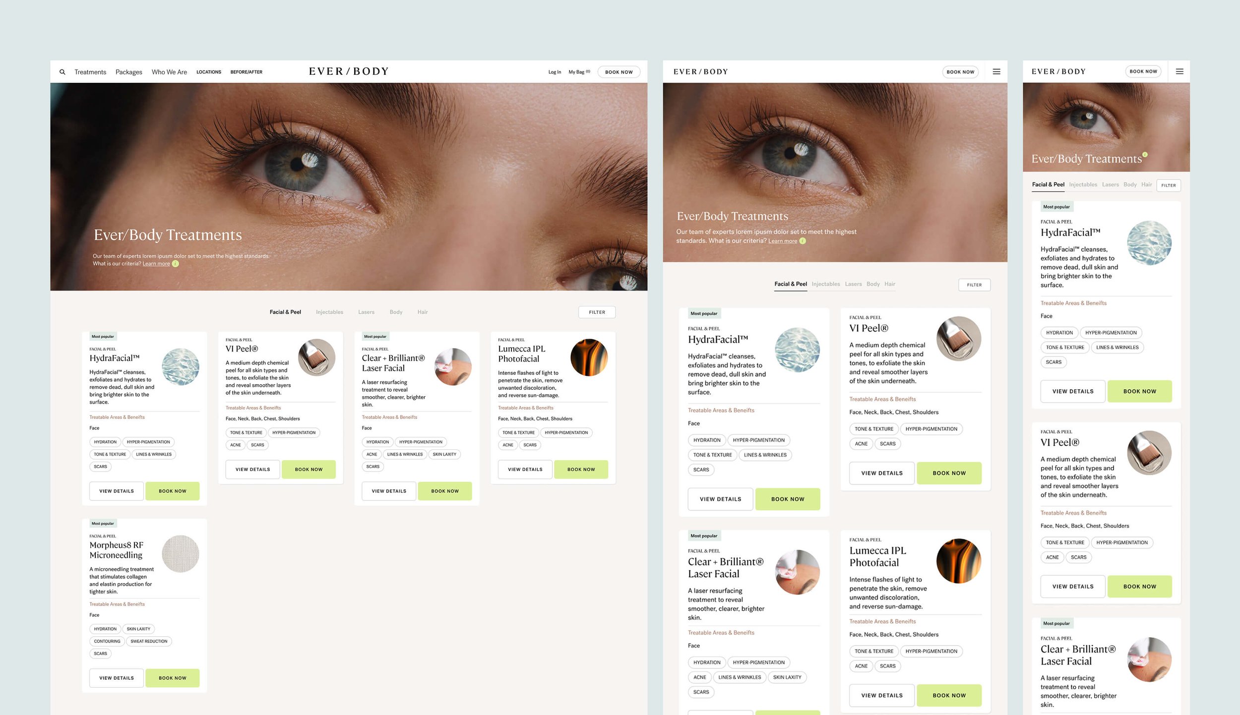 The main barrier for new clients was identifying the right treatment. The website simplified this by organizing treatment options by area and concern—making it easier for first-timers to choose and learn about Ever/Body’s offerings, their costs, and benefits. Providing full transparency put clients at ease, and allowed them to explore and learn about Ever/Body’s treatments at their own pace.