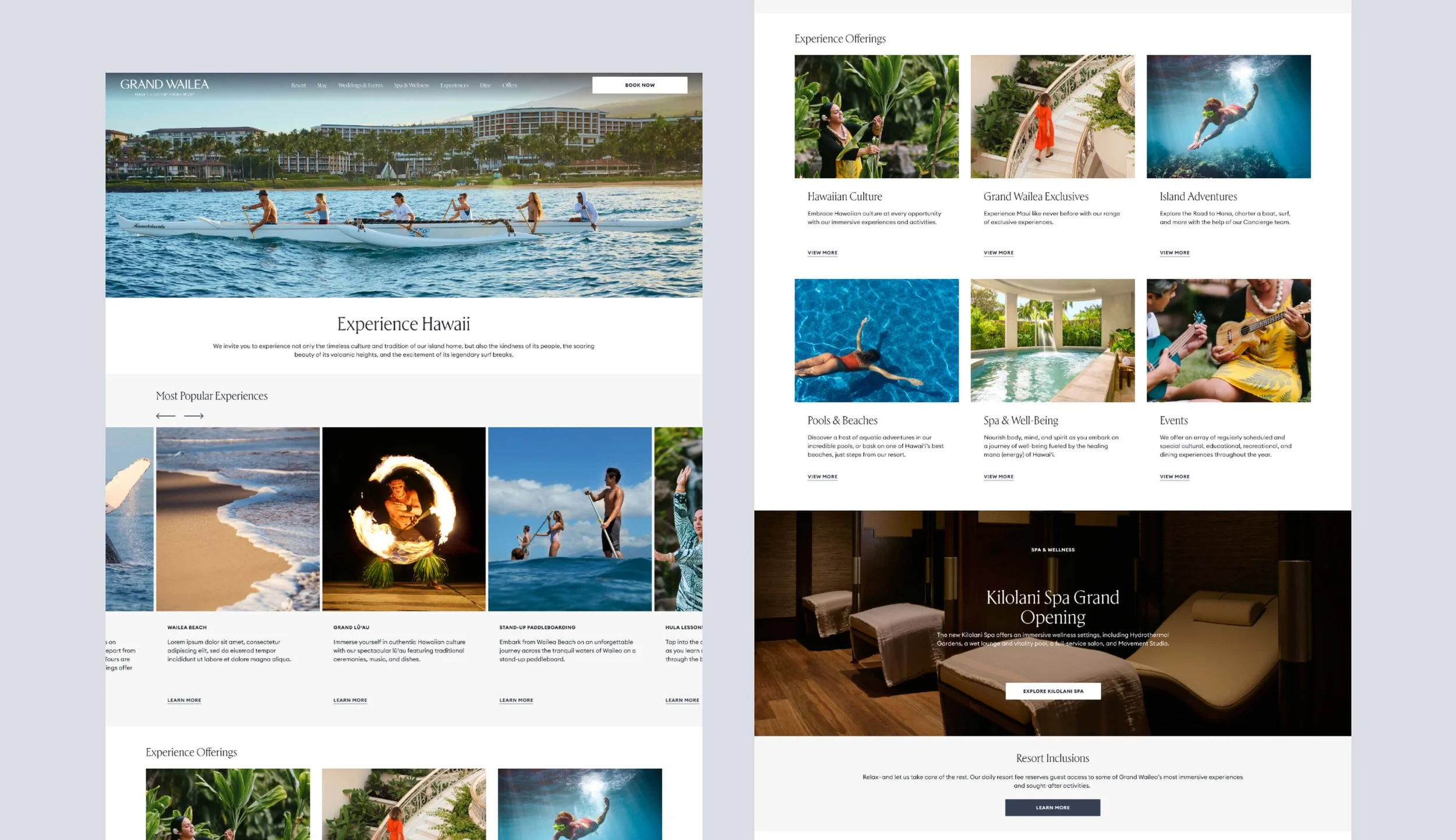Grand Wailea prides itself in its unique cultural and geographical experiences. The homepage features immersive video and photo content to showcase what Maui and the resort have to offer.